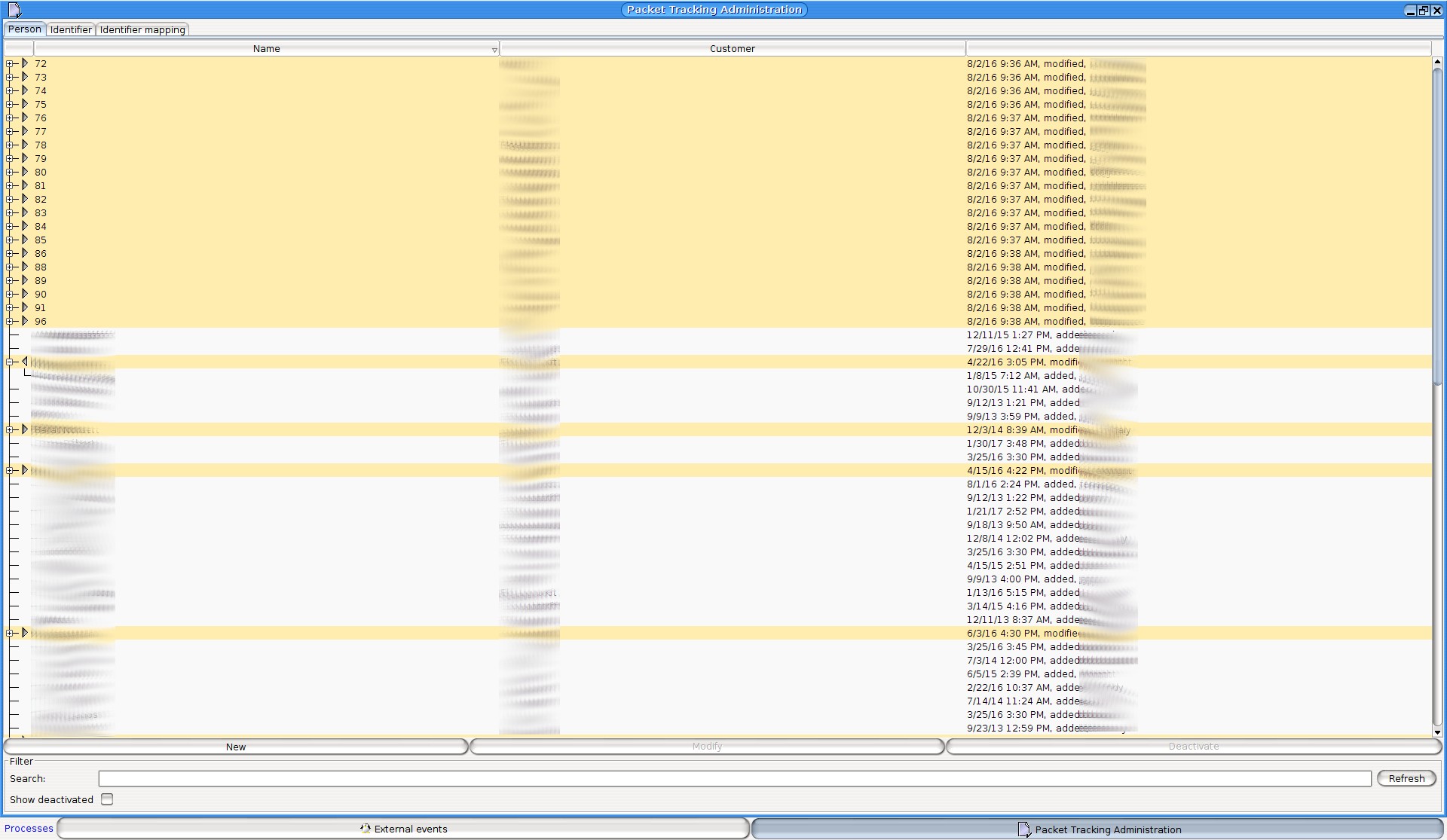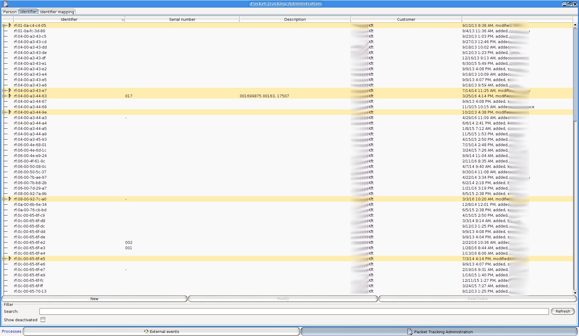 You can also perform searches on this interface. Under each table there is a search box that searches at least in the name column, but also for example in the “Identifiers” tab and in the “Comments” and “Serial number” columns. If you have permission to do so, you can also search in the “Customer” column.