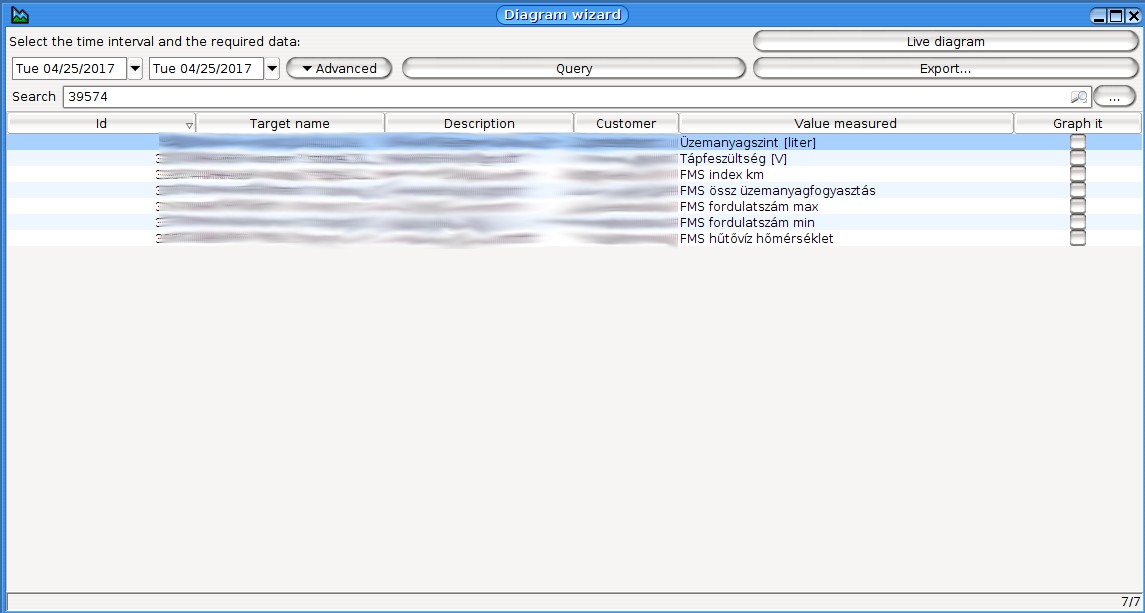 In the window that appears, the list of available channels for vehicle measurement is shown. Click in the box located to the right to select list elements. Any number of measurements can be selected, but it is not recommended to select more than 3 or 4 at a time for more transparency on the graph. You can select time intervals as described in the Help section on „Selecting the date”