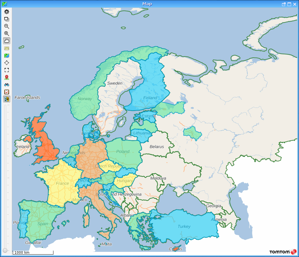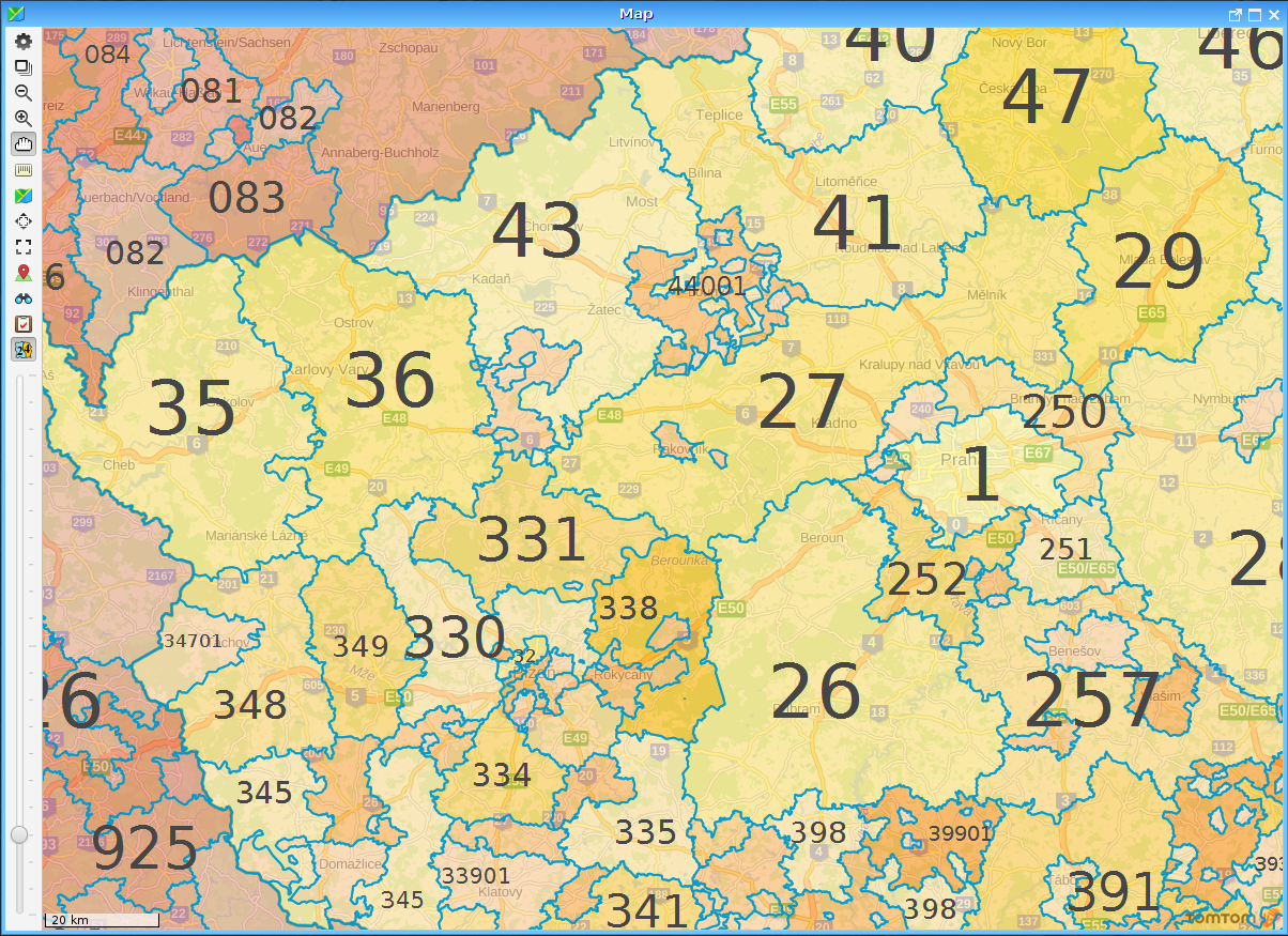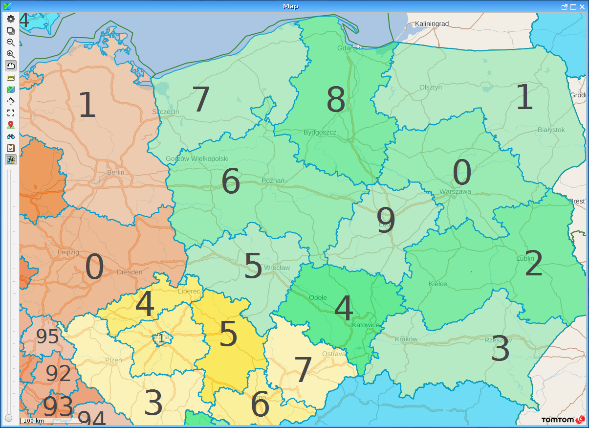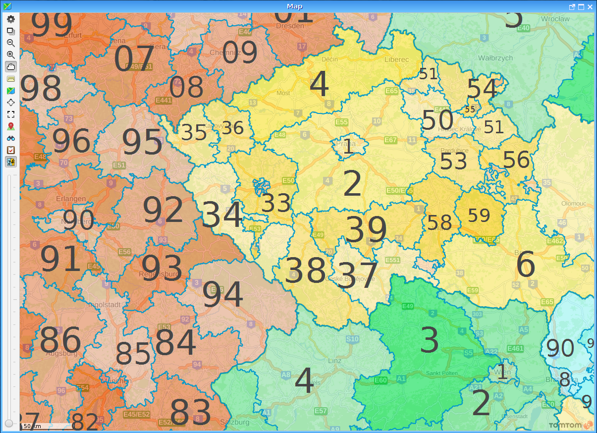 By zooming in, you will see a lot more information. Firstly, the postal districts will be visible (in most countries with numbers from 0 to 9), which divide the countries into smaller pieces
