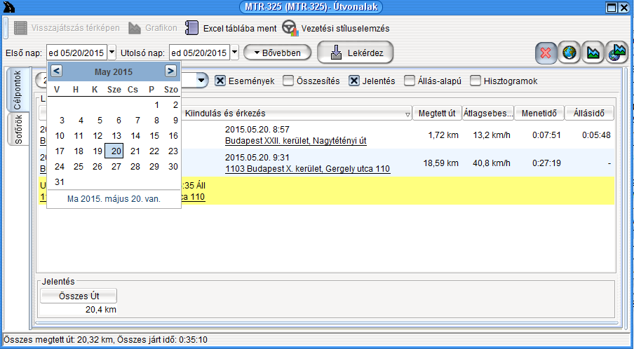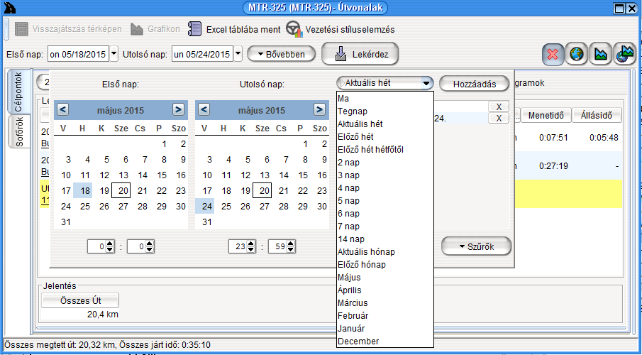 Click on the “More” button to display additional options. Using the mouse wheel you can jump back and forth in the months quickly and easily; to do so, move the mouse cursor over the calendar field. You can select pre-defined periods in the drop-down menu located next to the months set. The selected period can be saved with any name by pressing the “Save” button. The last five queried time interval and the querying periods with unique names are available at any time, and can be deleted with the “x” button next to their name.