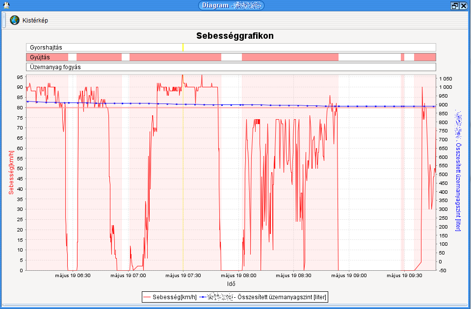 Amennyiben csak egy jármű adatsorát (adatsorait) kérdeztük le, Kistérkép gomb található bal oldalt a grafikon fölött, amivel térképen megjeleníthetjük a jármű helyzetét a kérdéses időintervallumra. Ez esetben a grafikon egy pontjára kattintva a jármű ikonja a megfelelő helyre ugrik az útvonalon.