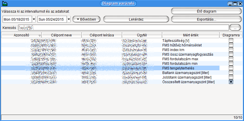 A megjelenő ablakban a járművön elérhető mérőcsatornák listája látható. A kijelöléshez a jobb oldalon elhelyezkedő négyzetre kell kattintani. Bármennyi mérés kijelölhető, de a grafikon áttekinthetősége érdekében 3-4-nél többet nem javasolt egyszerre kijelölni. Az időintervallumok megválasztása a „Dátumválasztás” súgóban alkalmazottak szerint történik.