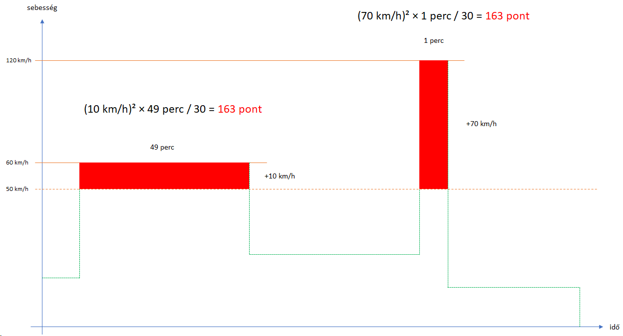 - az első esetben egy 10km/h-ás sebesség túllépés történik. Ez 49 percen keresztül folyamatosan fennáll. Így 163 pont keletkezik a gyorshajtás miatt