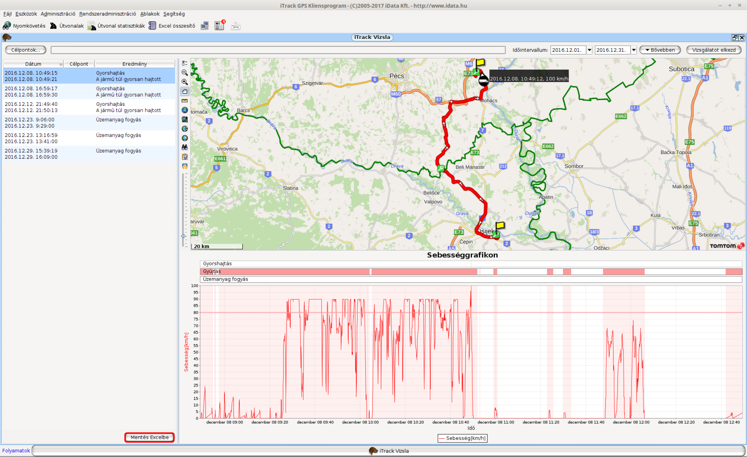 A művelet eltarthat néhány percig. Az eredmény a bal oldali listában látható. Egy jelentésre kattintva az ablak jobb felében felül térképet láthatunk ami mutatja az útvonal-szakaszt amelyen az eset történt. A térkép kezelése a nyomkövetésnél megszokott módon zajlik. Alatta grafikonon láthatjuk az idevágó adatokat, a jelentés okául szolgáló részletet besatírozva. A grafikonon kattintva az autó a térképen az útvonala megfelelő részére ugrik. A grafikont a szokásos módon kezelhetjük.