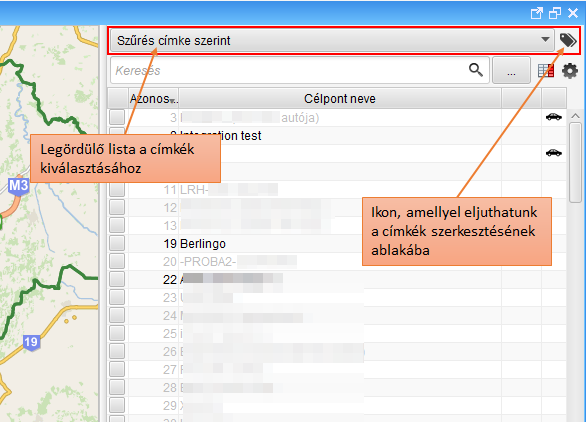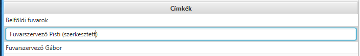 Itt található az összes eddig felvett címke. Ha kiválasztunk egy címkét, akkor a jobb oldali táblázatban láthatjuk, hogy mely járművekre van rátéve az adott címke. Egyszerre csak egy címke választható ki a listában. Ha szeretnénk a címke nevét átírni, csak kétszer kattintsunk a címke nevére és ekkor már szerkeszthető a címke neve