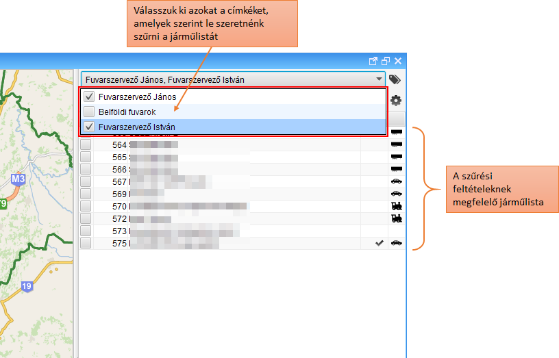Ha kiválasztottunk egy vagy több címkét a listából, megtörténik a járműlista szűrése