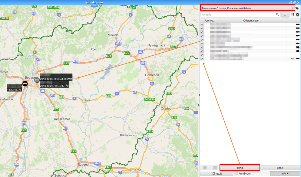 Ezután elég ha rákattintunk a "Mind" gombra és a szűrésnek megfelelő járművek nyomkövetésre kerülnek. A beállított szűrés az iTrack újraindítása után is megmarad.