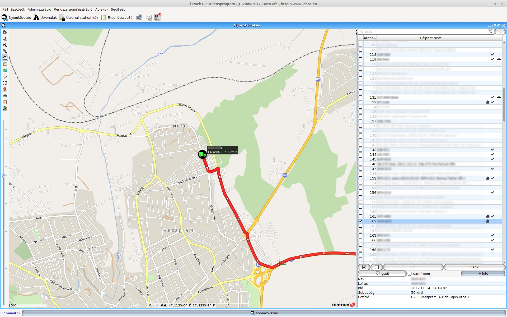 A térképen láthatóak azok a célpontok, melyeket a jobb oldali listában nyomkövetésre megjelöltünk. Az egy vagy több térképre helyezett jármű állapotáról többféle adatot olvashatunk (a piros kisautó mellett), többek között a sebességét és, hogy mikori az utolsó adat amit küldött.