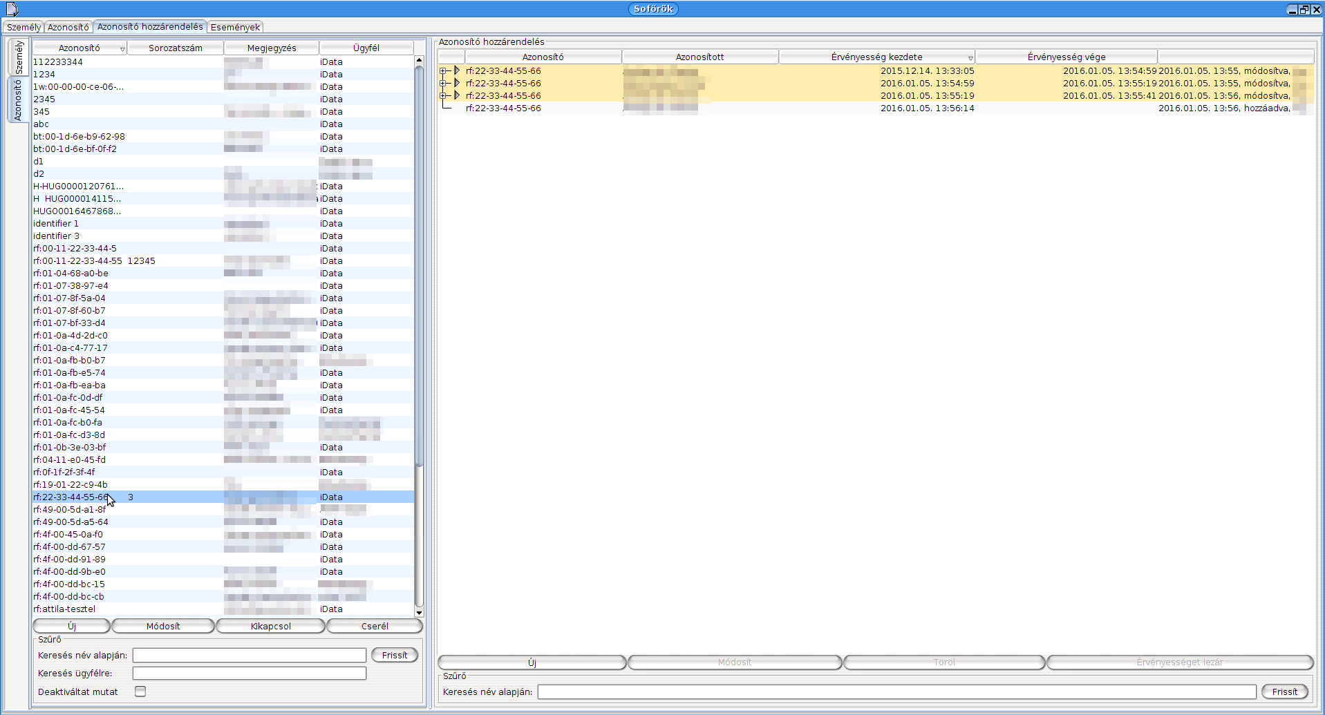 Az „Azonosító hozzárendelés” szekciónál az „Új” gombbal a („Személy” szekciónál) kijelölt sofőrhöz lehet egy vagy több azonosítót beállítani. Meg kell adni az érvényesség kezdetének időpontját másodpercre pontosan (az aktuális időt ajánlja fel, de korábbi időpont is megadható). Az érvényesség végének időpontját nem kötelező megadni (a program felajánlja, hogy ne legyen lejárata). Mindegyik adat módosítható. A „Töröl” gombbal a kijelölt hozzárendelést lehet törölni, az „Érvényesség lezár” gombbal pedig az aktuális időpontot rendeli az érvényesség végéhez.