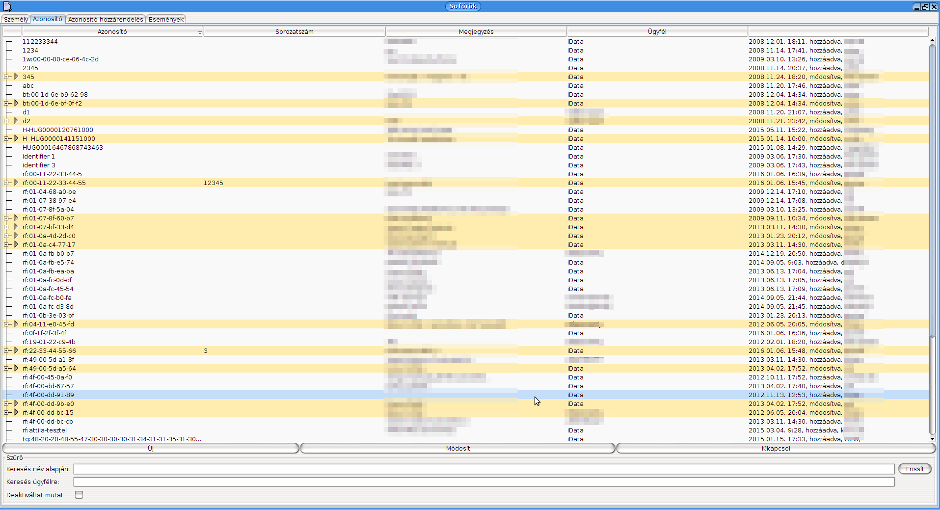 A „Módosít” gombbal bármely adatát meg lehet változtatni az azonosítónak (amennyiben van hozzá jogosultsága). A „Kikapcsol” gombbal lehet a nem használt azonosítók érvényességét visszavonni. Aktív sofőrhöz rendelt azonosító esetén a használójától megvonja (lezárja az érvényességét). A deaktivált azonosítók bármikor újra aktiválhatók.