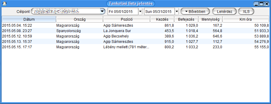 A lekérdezni kívánt jármű (célpont) és az időintervallum a szokásos módon választható. Ez a szolgáltatás csak olyan célpontoknál hoz eredményt, amelyekbe üzemanyagszint mérő szonda van beszerelve. A megjelenő listában a tankolás pontos időpontja (év, hónap, nap, óra, perc), a tankolás helyszíne (pozíció; ismert pont esetén a megnevezés), a betöltés előtti és utáni üzemanyagszint, a tankolási mennyiség, valamint igény szerint a kilóméteróra állása látható.
