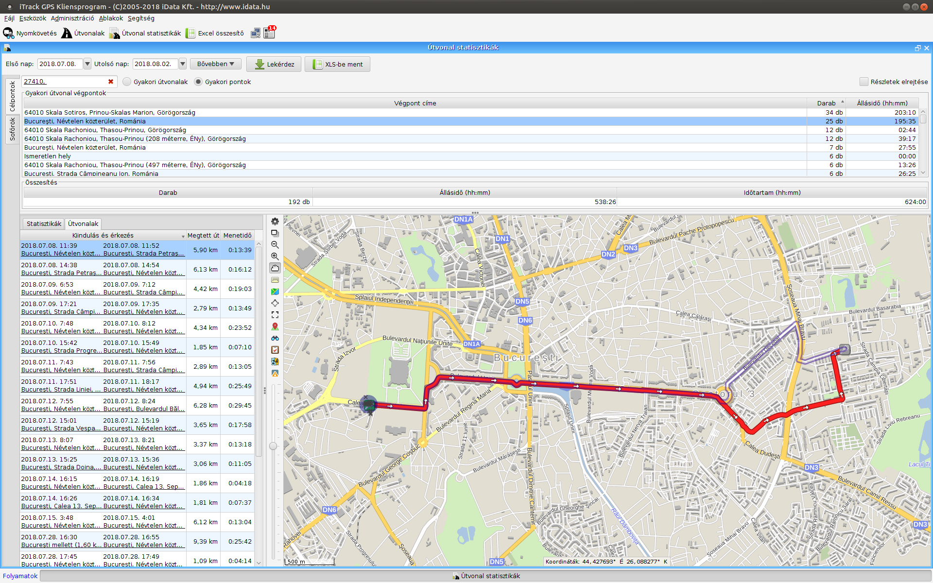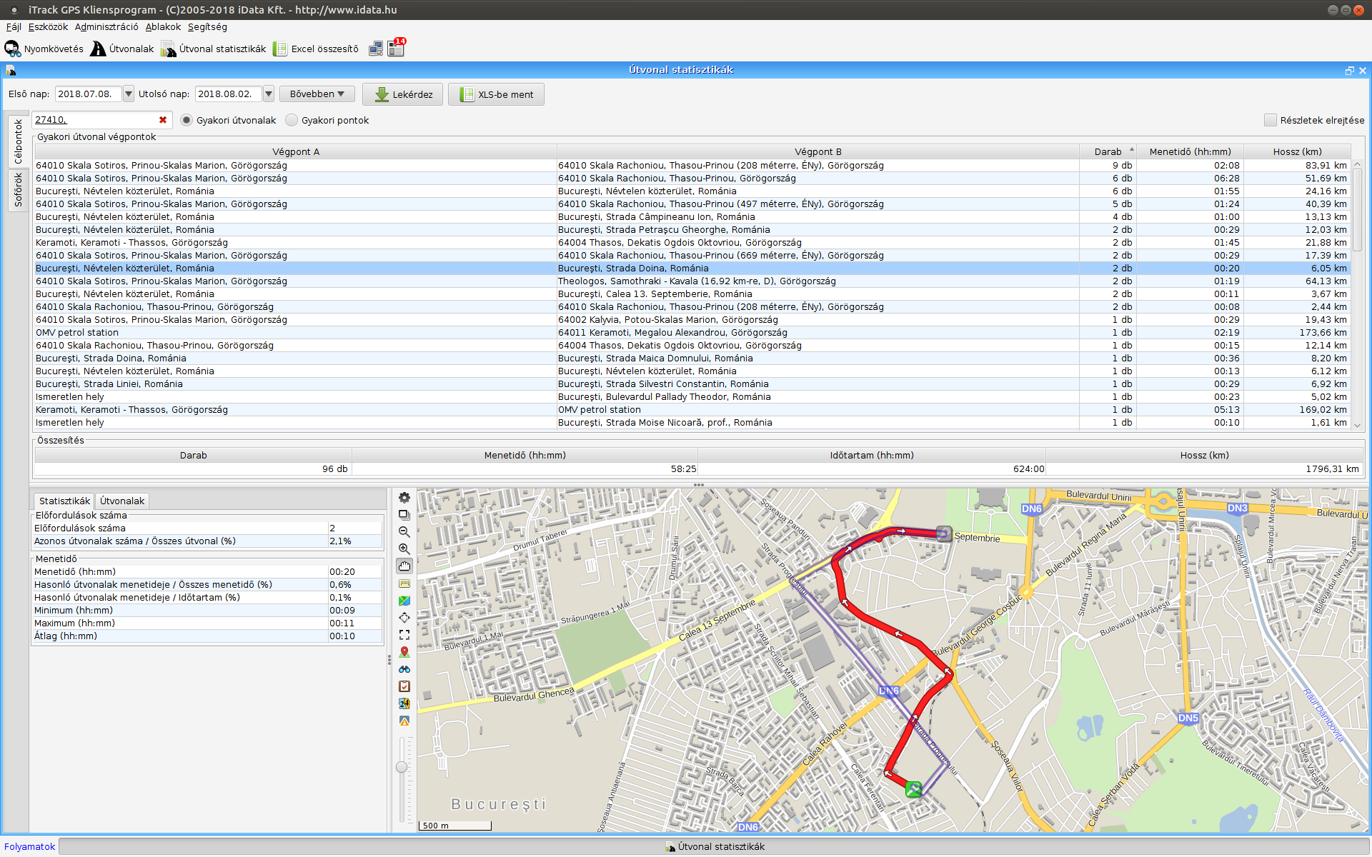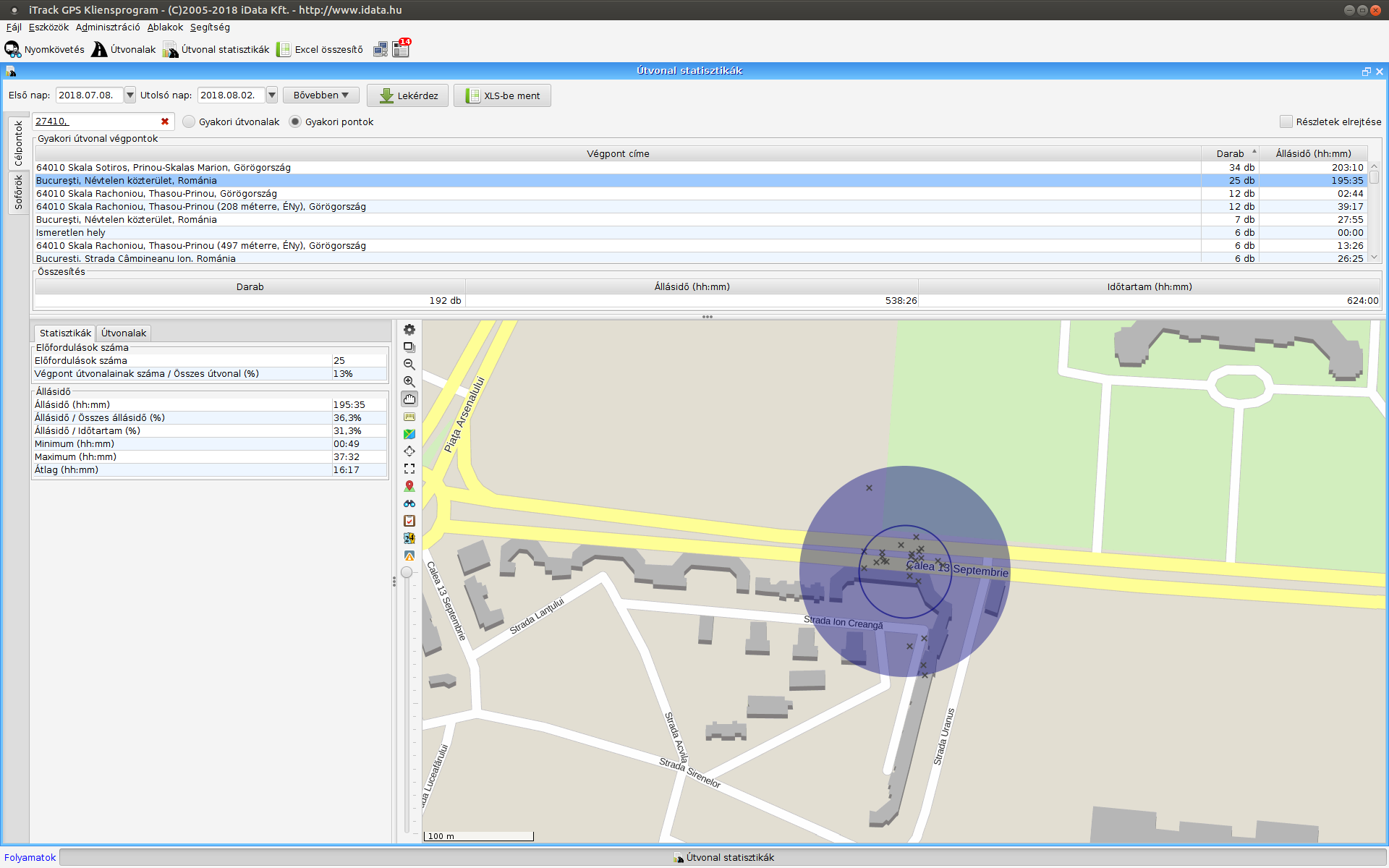 Az útvonal statisztikák ablakban lehetőség van a járművek, illetve sofőrök gyakori útvonalainak, gyakran látogatott helyeinek kilistázására, majd az egyes csoportok adataiból készült statisztikák megjelenítésére. Válasszuk ki az időintervallumot, majd a célpontok szerinti nézetben a járművet, sofőrök szerinti nézetben a sofőrt. A Lekérdez gombra kattintva megkapjuk a gyakori útvonalak/gyakori útvonal végpontok listáját. Az XLS-be ment gomb megnyomásával az adatok exportálhatók Excel táblázatba.