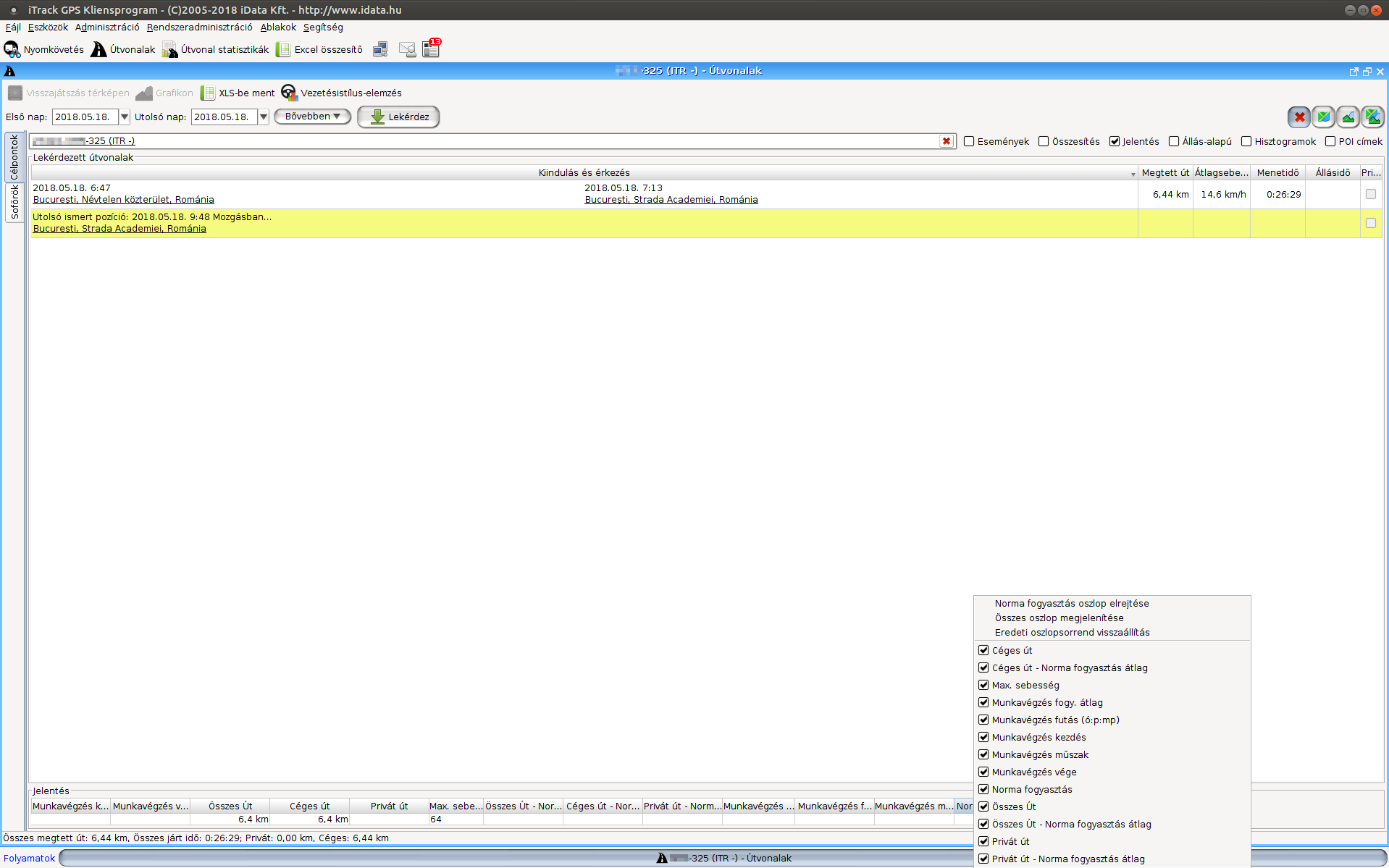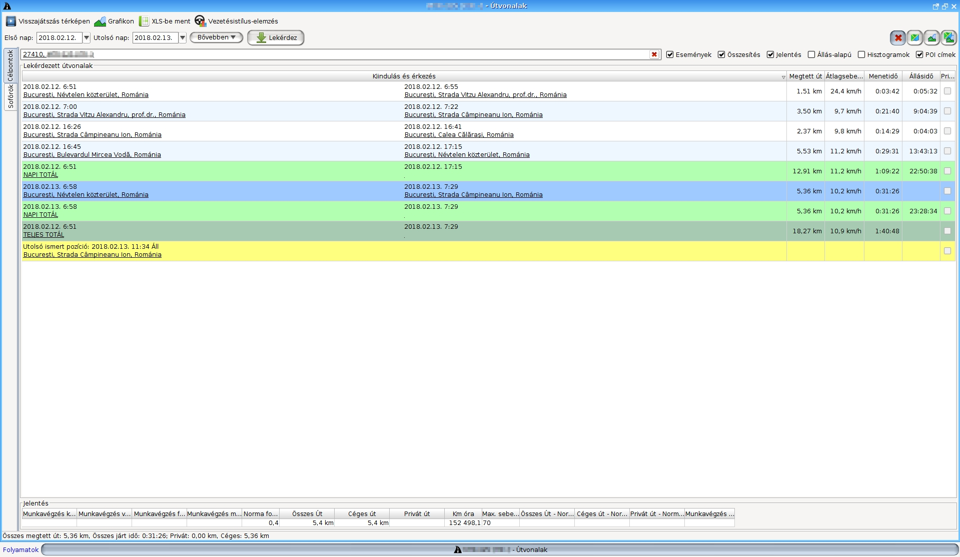 A „Jelentés” opciót bekapcsolva további információk (tankolások száma, billentések száma stb) jeleníthetők meg a kijelölt szakaszokra. Amennyiben nincs egyetlen útszakasz sem kijelölve, a teljes lekérdezett időszakra mutatja meg a jelentés adatait. A jelentés oszlopai igény szerint sorrendezhetők, valamint jobb egérgomb kattintással az oszlopokon ki- és bekapcsolhatók.