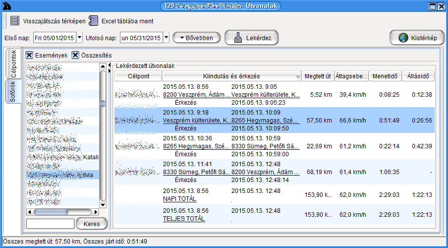 A „Sofőrök” fülre kattintás után ki lehet választani, hogy mely gépjárművezetőről (bal oldali lista) szeretne útvonallistát készíteni. Itt is lehetséges napi és teljes időszakra vonatkozó összesítést kérni, valamint az események is megjeleníthetők.