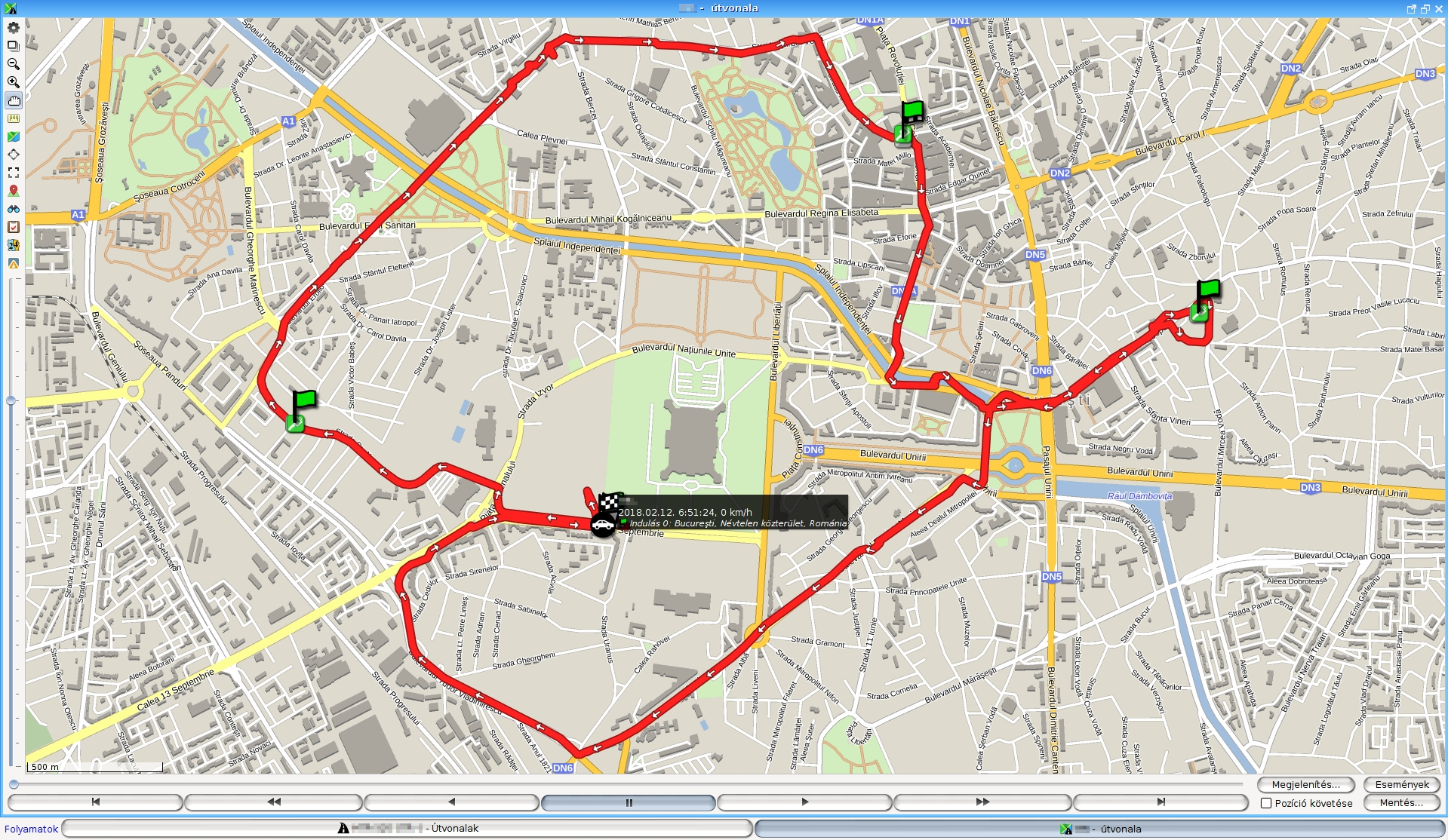 Ez esetben szokásos térkép jelenik meg, benne a jármű az indulási pontban, és egy vastag piros vonal mutatja a megtett utat.