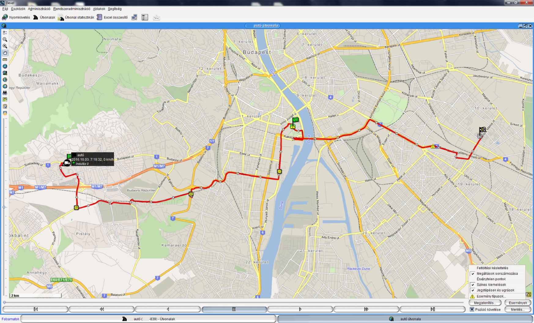 A mellette található „Események” gombra kattintva különböző események listáját kapjuk, melyekre rá is kattinthatunk, hogy a jármű egyből odaugorjon, ahol az adott esemény történt.