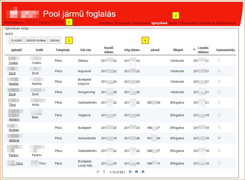 - Menülista: Kezdőlap / Új igénylés / Karbantartás / Igénylések / Autók / Felhasználók / Beállítások / Kijelentkezés