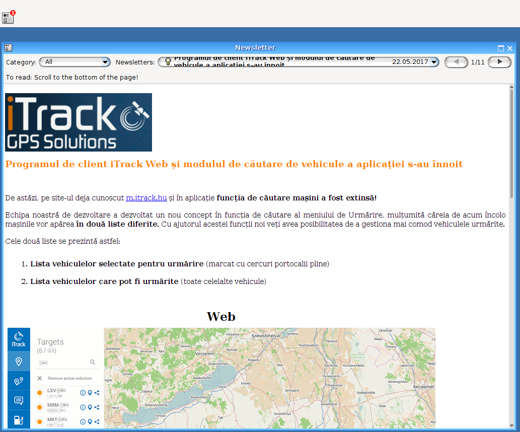 Buletinul informativ vă oferă informaţii actuale. Dacă apare o informaţie nouă referitoare la sistem, atunci la pornirea programului iTrack client apare automat noul buletin informativ. După citire buletinul informativ nu mai apare, dar poate fi afişat oricând cu ajutorul acestui item de meniu. În pătrăţelul din colţul din stânga jos puteţi bifa că aţi citit buletinul. Sub opţiunea Categorii puteţi alege dintre trei itemi de meniu: Important, Notificare, Pontul zilei. Timp de activare şi de expirare setabil, ceea ce înseamnă că buletinele informative rămân afişate până la data setată.