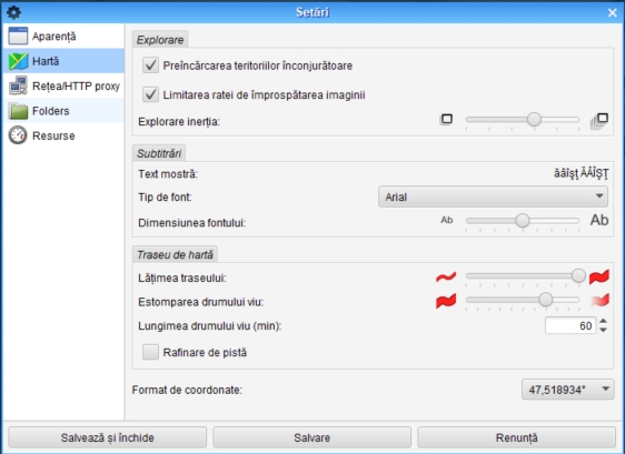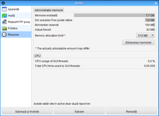 La puctul de Memory allocation limit se poate seta mărimea memoriei folosită de iTrack. Valorile pe care se poate alege sunt: 256 MB, 512 MB, 1 GB, 1.5 GB, 2 GB.