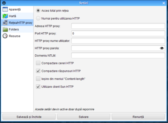 Adresa proxy, port, setarea numelui de utilizator şi parolei conform setărilor browser-ului care funcţionează