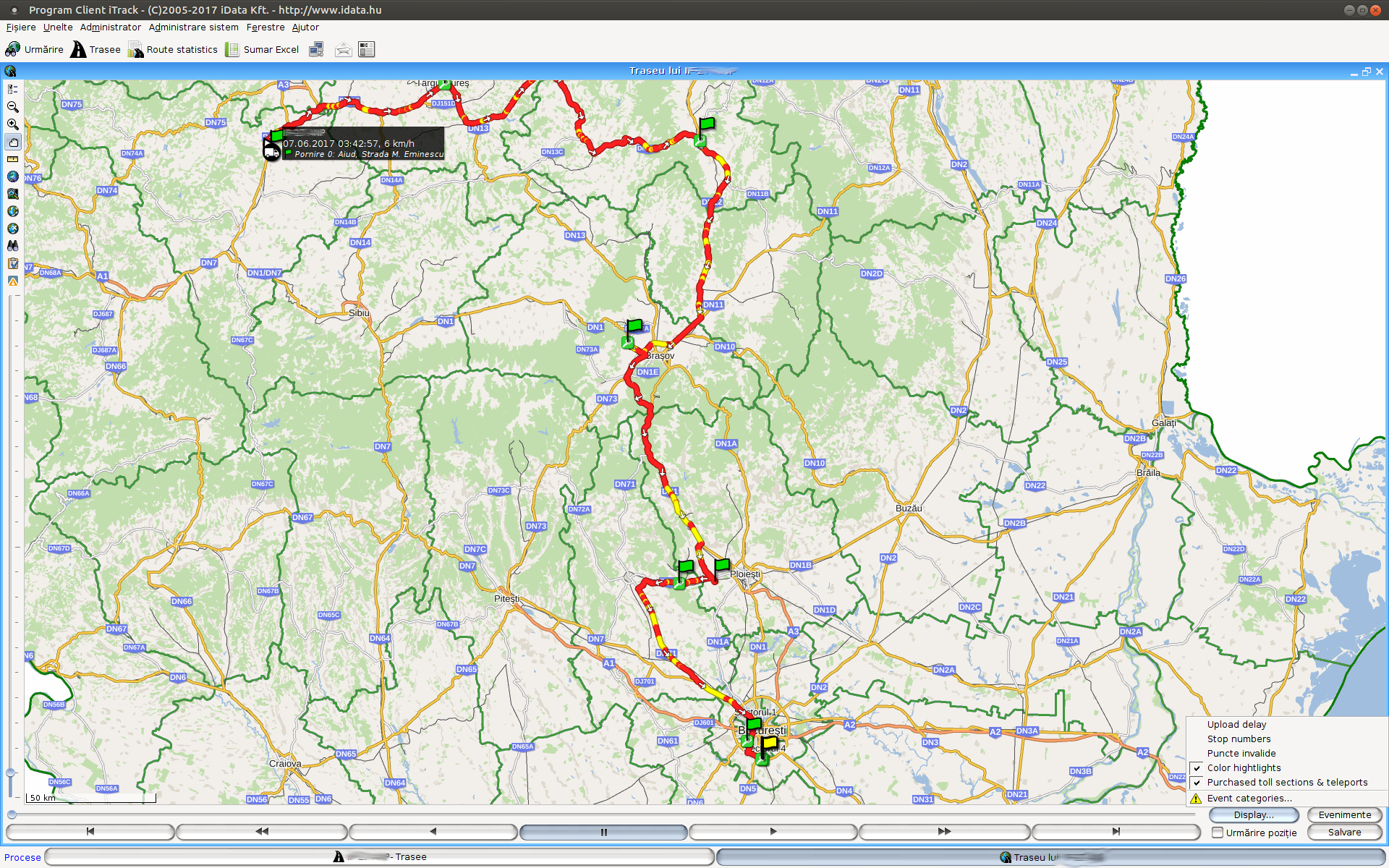 de asemenea, marcarea cu o altă culoare (nici roşie, nici gri) a traseului parcurs înseamnă alte cazuri specifice clientului, ca circulaţia cu uşa deschisă a spaţiului de încărcare, depăşirea vitezei, etc.