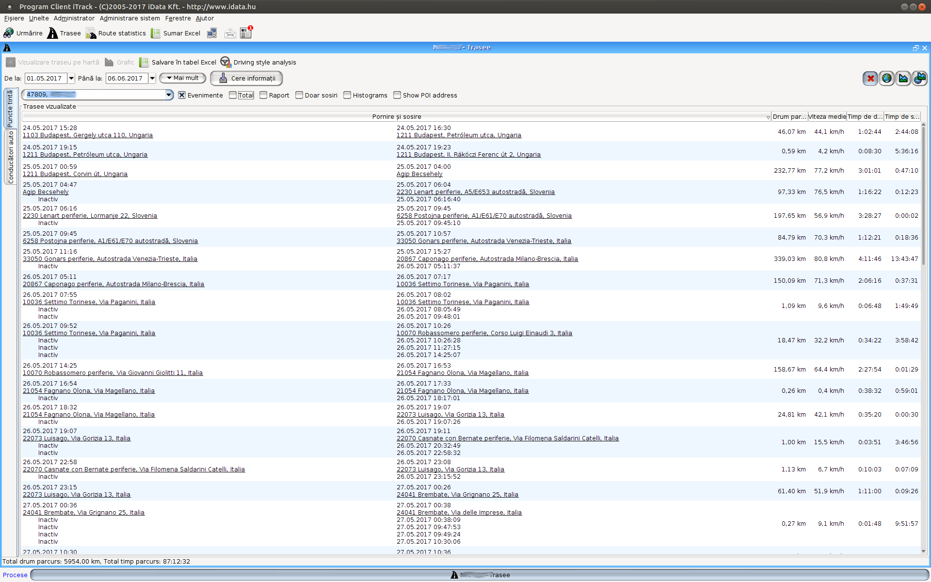 Selectând opţiunea „Adrese POI“ se afişează adresa completă a punctelor importante. Aceasta apare şi în export Excel.
