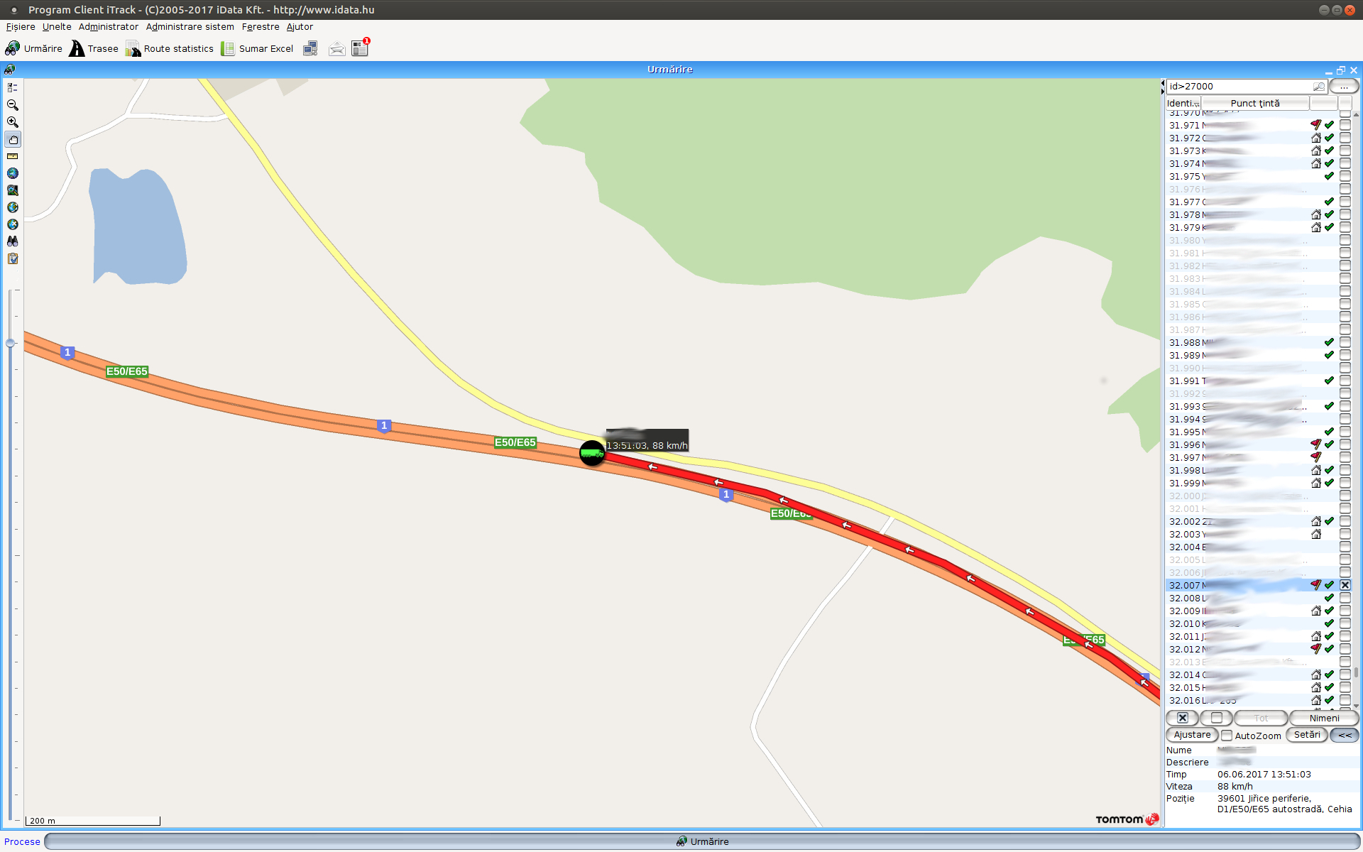 Pe hartă se văd acele ţinte care au fost marcate pentru monitorizare pe lista din partea dreaptă. Despre starea autovehiculelor afişate pe o hartă sau pe mai multe hărţi puteţi citi mai multe date (lângă semnul de maşinuţă roşie), printre altele viteza şi timpul precis al ultimelor date transmise.