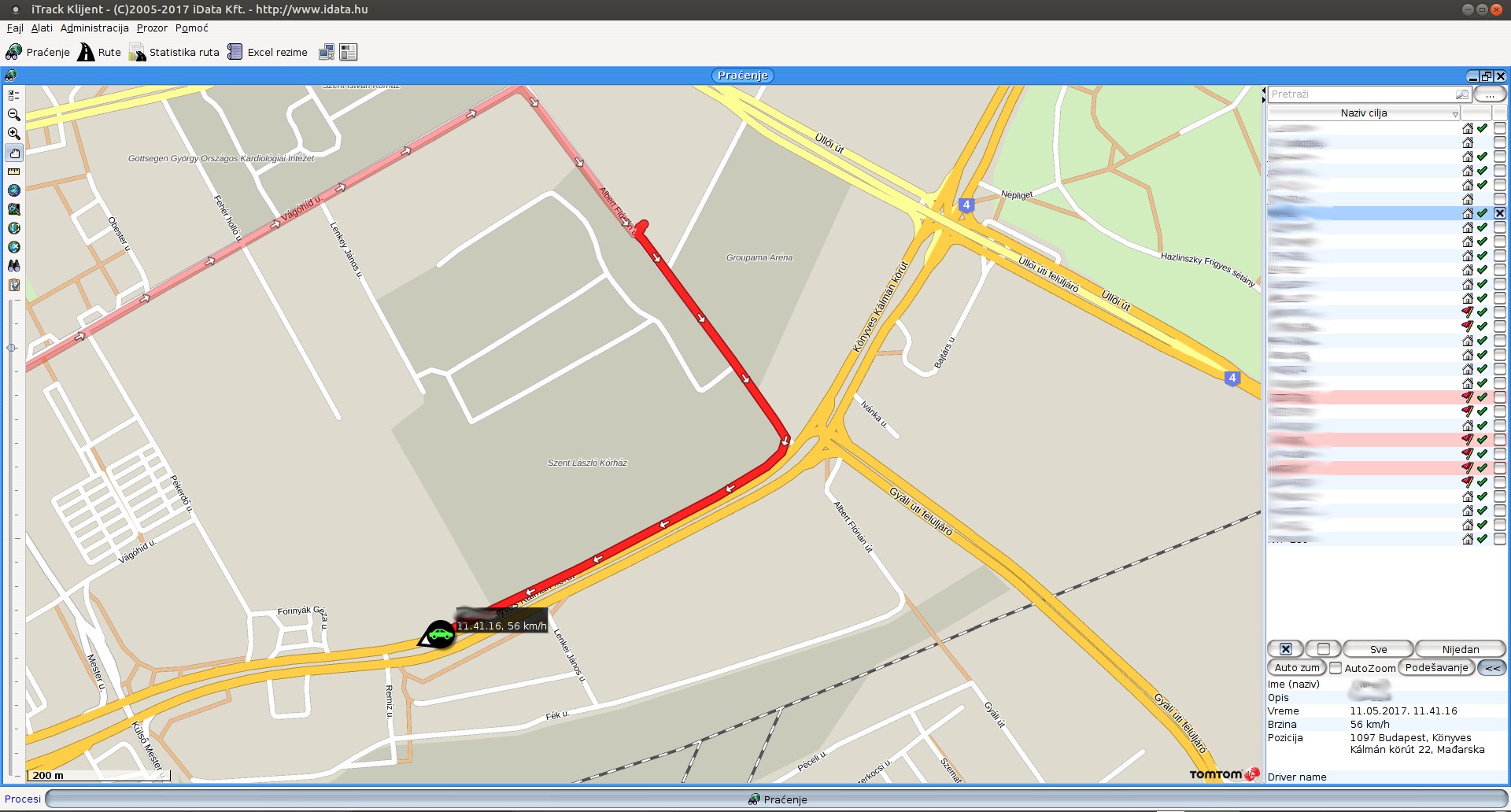 Na mapi se vide one ciljne tačke, koje smo označili na listi sa desne strane za praćenje. O stanju jednog ili više vozila koje smo stavili na mapu, možemo pročitati više podataka (pored malog crvenog auta), između ostalog brzinu i od kada je zadnji podatak koji je poslao.