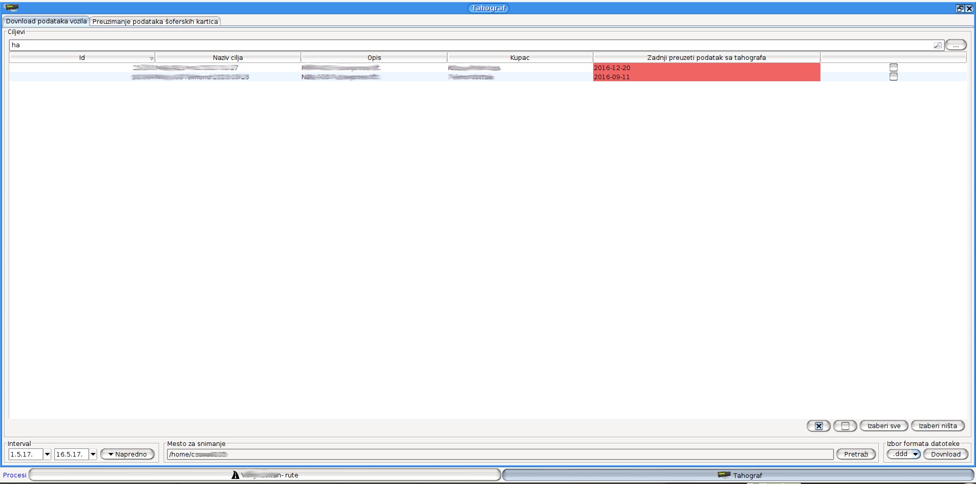 - ˙ Tabela: Možete odabrati jedan red, više redova u nizu [držeći taster Shift pritisnuto], ili više proizvoljnih redova [držeći Ctrl taster pritisnut]. Uslov za pokretanje preuzimanja je da barem jedan mali kvadratić na kraju reda bude označen sa „x“.