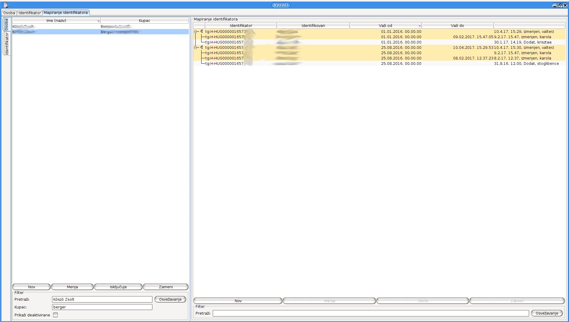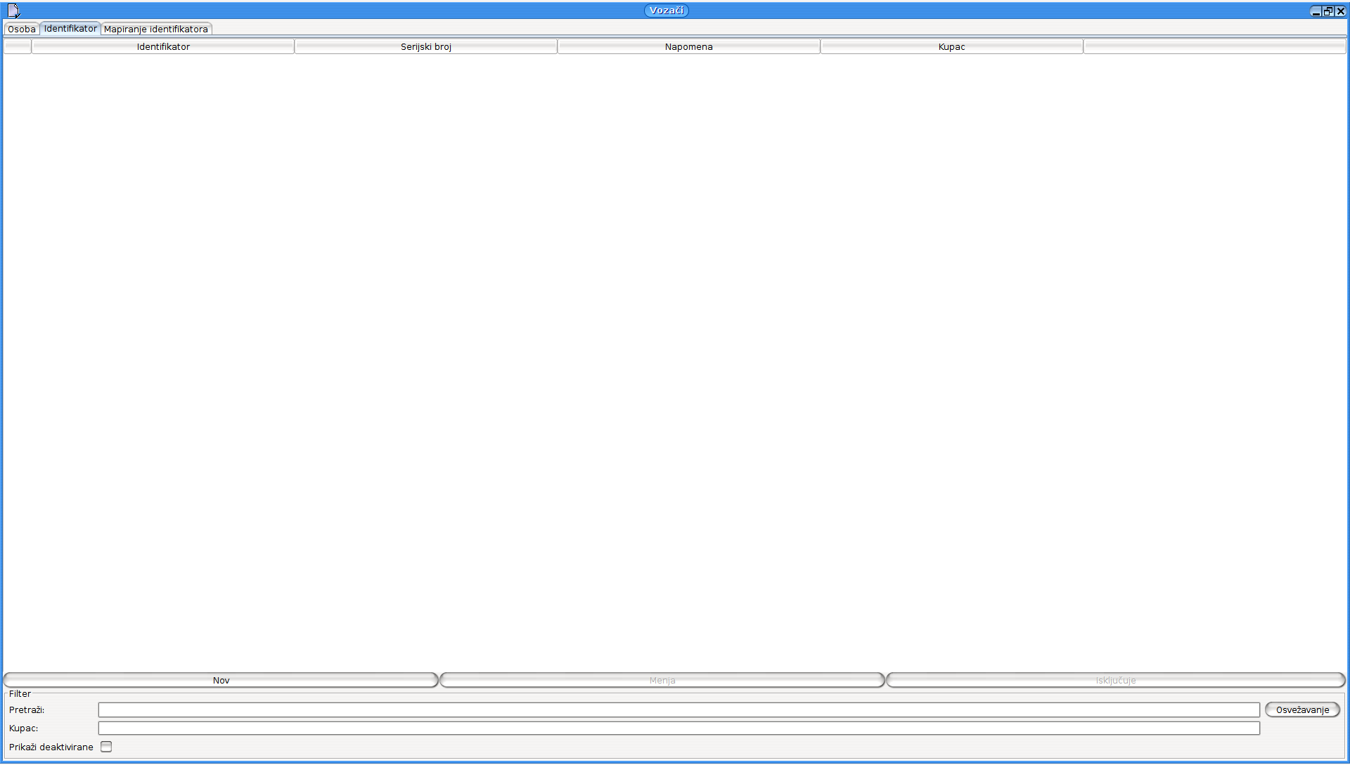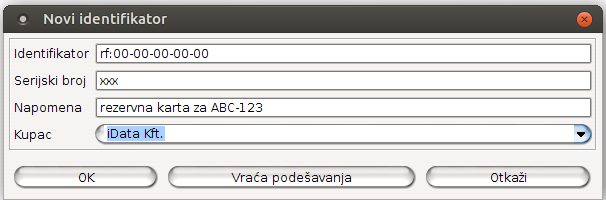 Sa dodavanjem identifikatora u sekciji „Identifikator“ sa dugmetom „Nov“ takođe se mogu dodati novi identifikatori (isto kao i na „Identifikator“ kvačici). I ostala dugmad funkcionišu na isti način. Sa dugmetom „Menja“ može se menjati vozač koji pripada identifikatoru.