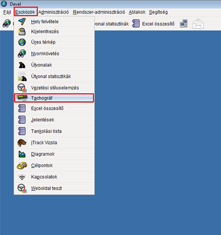 Lépjen be az iTrack rendszer „Eszközök” főmenüjébe, ahol egy új menüpontot talál „Tachográf” néven. Ezt kiválasztva, egy új ablak nyílik meg két füllel: