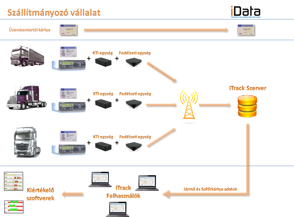 A KTI egység továbbítja a jármű és sofőrkártya adatokat a Fedélzeti egységbe. Innen mobilinternet (GPRS) segítségével jut el az iData szerverébe, ahol biztonságosan körülmények között tároljuk a letöltött információkat.